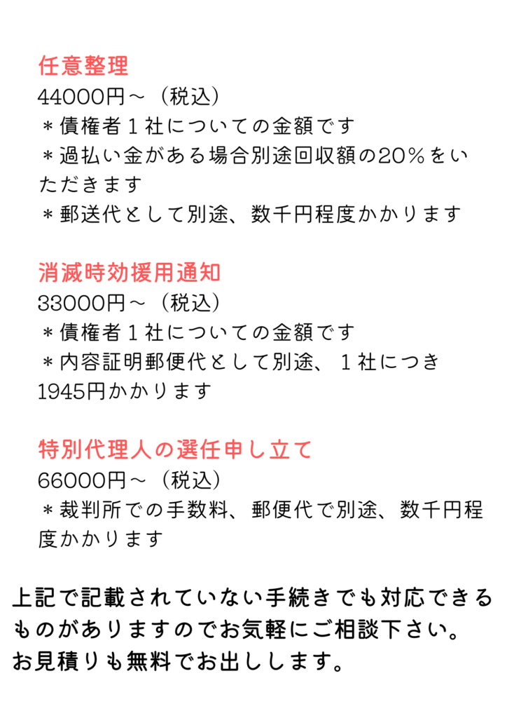 借金でお悩みの方へ向けて、時効援用通知や自己破産、個人民事再生、任意整理などの債務整理手続きも承っております。(時効援用、任意整理は元本140万円以下の事案に限ります)報酬支払は分割払いにも対応しております。