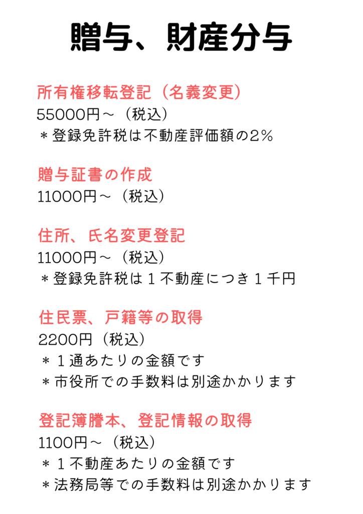 当所では、贈与や離婚に伴う財産分与の名義変更等各種登記手続きも承っております。